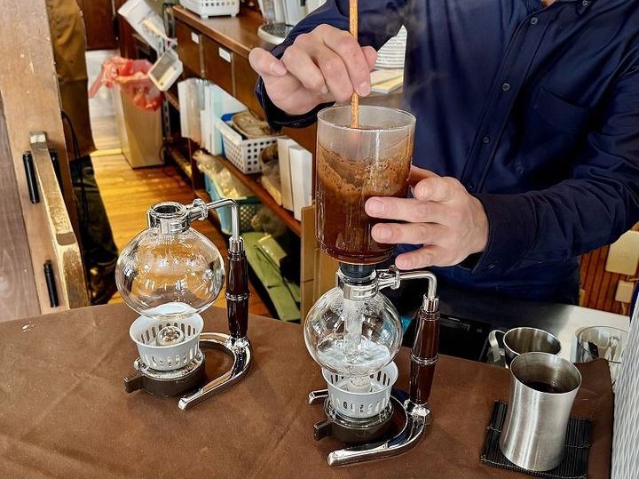 写真は蒸気圧を利用して抽出するサイフォンコーヒーを作っている様子。