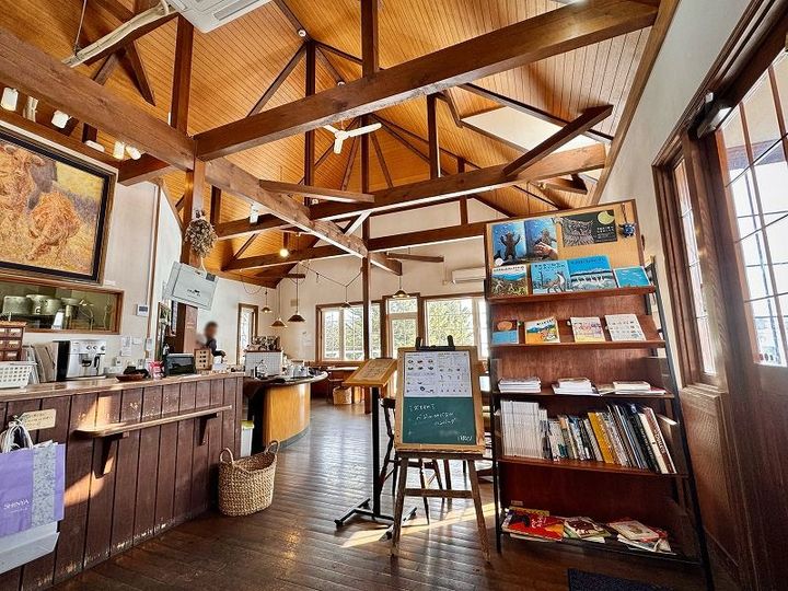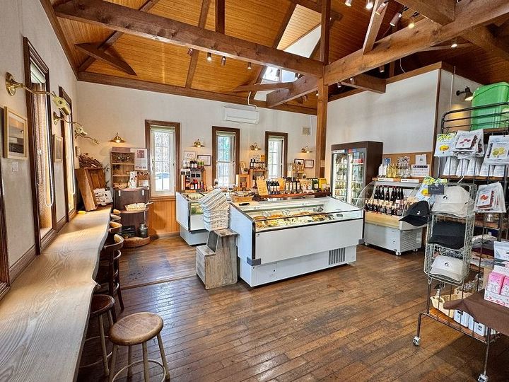 木を基調とした暖かい雰囲気に包まれた店内では、自家製の食品類とオリジナルグッズが販売されています。購入したデザートやアイスクリームをその場で食べられるイートインコーナーも完備。