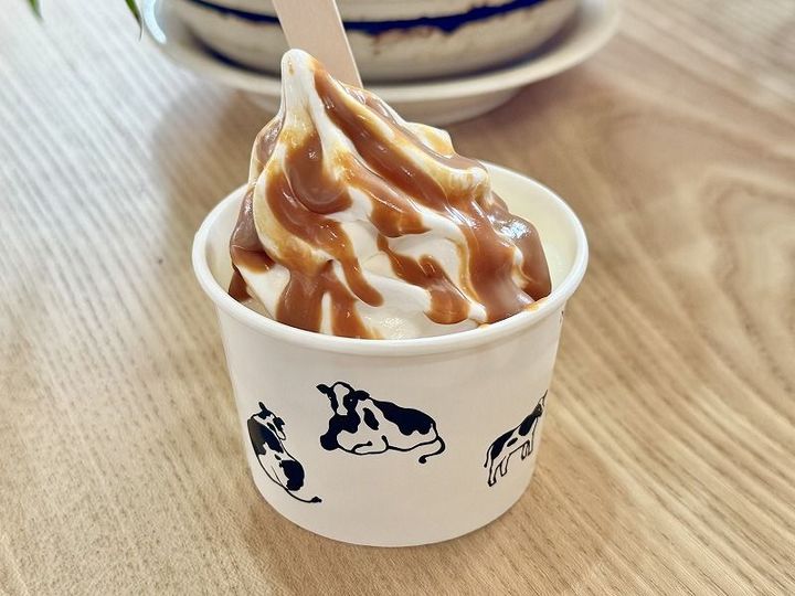 せっかくなので、生キャラメルがたっぷりかかったソフトクリームを注文してみました。濃厚なミルクの風味とキャラメルの甘さ・ほろ苦さが絶妙に絡み合ってとっても美味です。