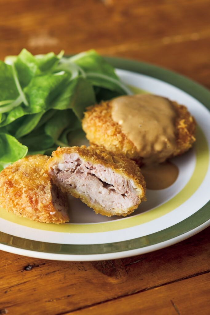 豚肉はパックから取り出したままの状態で幅2cmに切り、塩、こしょうをまぶす。4等分して、空気を抜くようにつぶしながら平らな小判形(約6×8cm、厚さ約2cm弱)に成形する。〈A〉をからめ、パン粉をまぶして平らに形を整える。