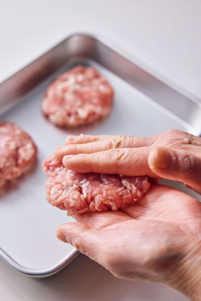 豚こまは、ぎゅっと握って空気を抜くように押すと、しっかりまとまります。中まで火が通りやすいように、厚さは2cm弱を守って。