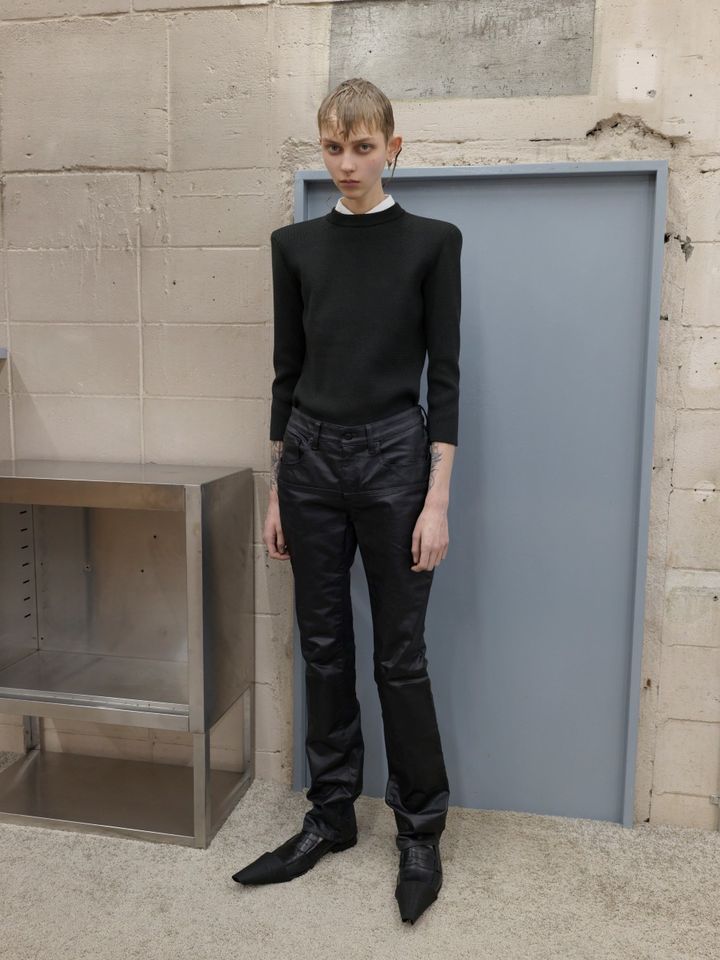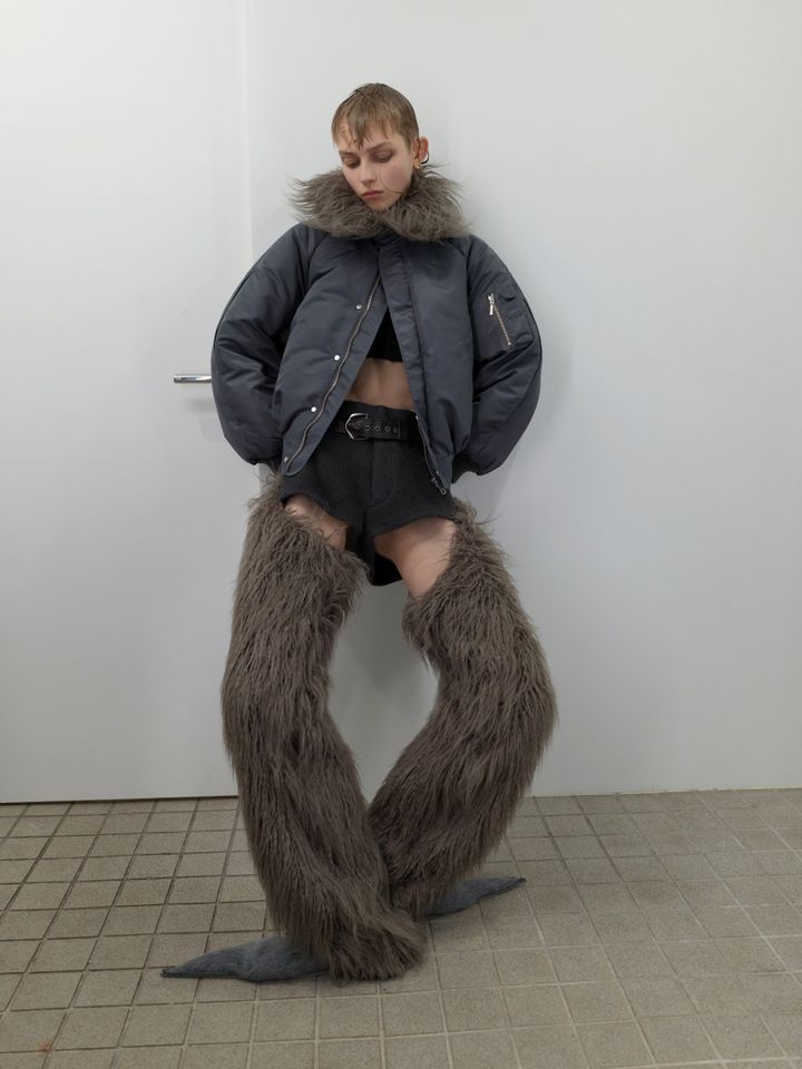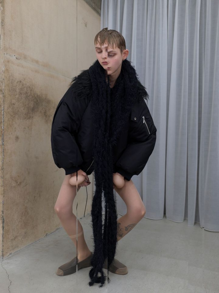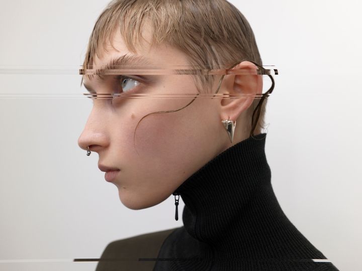 歯をモチーフにしたピアスや肋骨の造形にまつわるハーネスなど、スタイリングに新たな動きを加えるアクセサリーも数多く並ぶ。