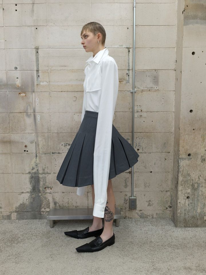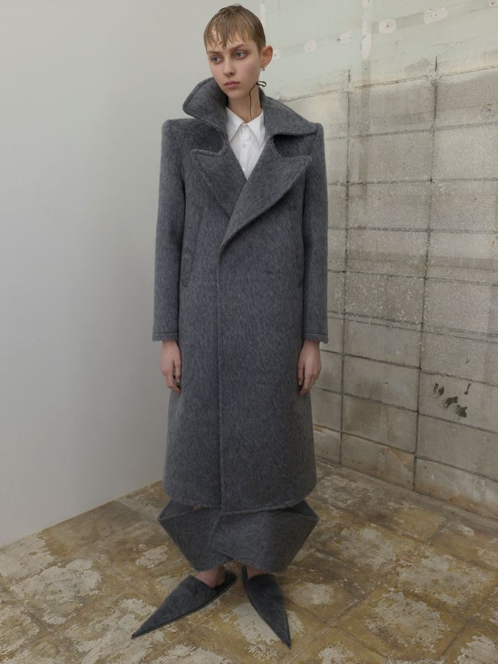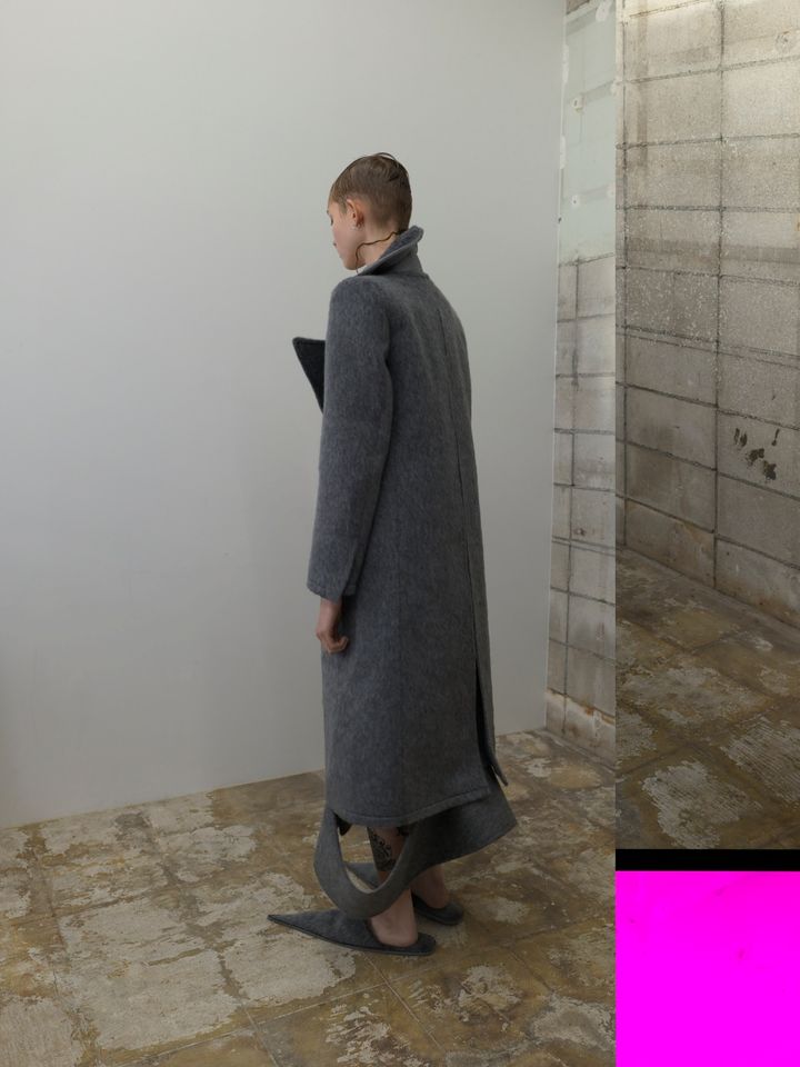 初めての制作となるロングコートは、スクエアショルダーやカッティングを配置した裾によって、予測不可能な動きを表現。