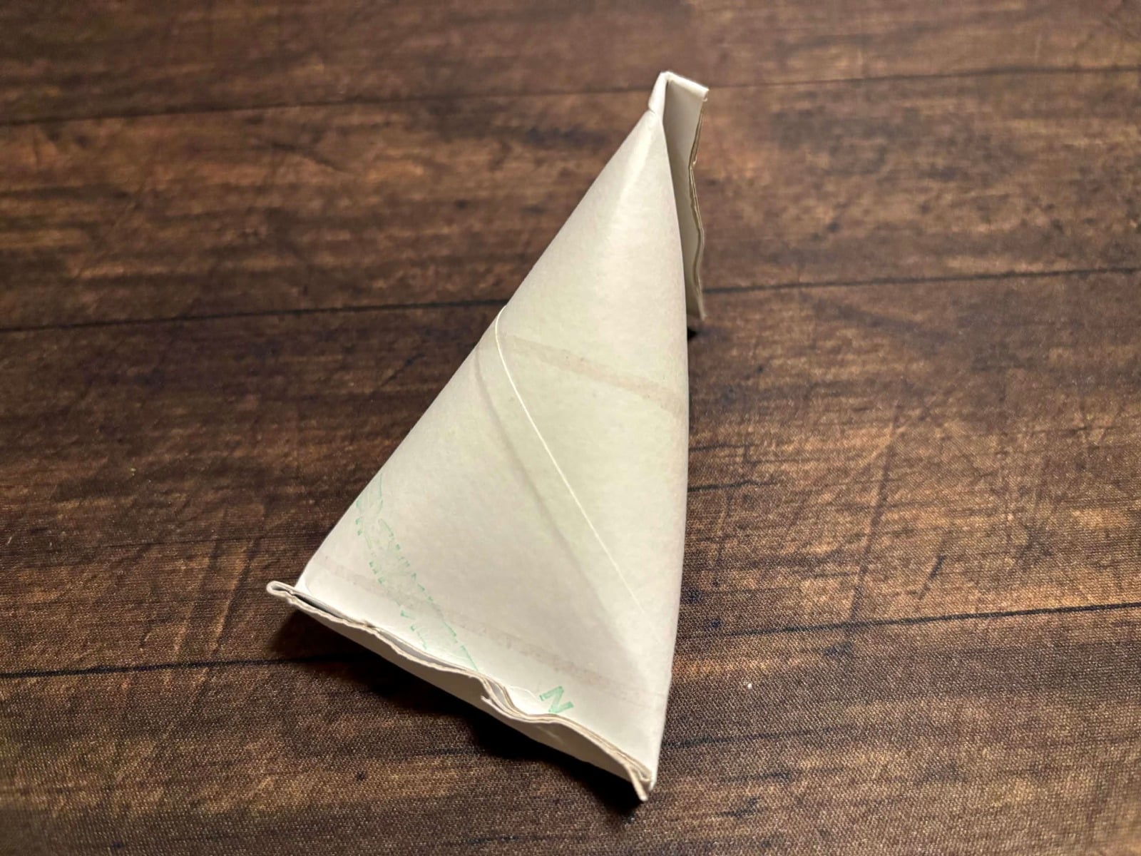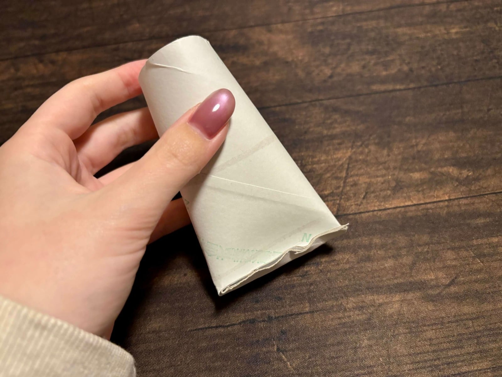 2.反対側の端は、先程と向きを変えて、写真のように折ります。三角形のような形になります。