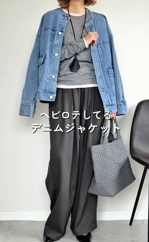 ノーカラーのデニムジャケットにグレーのシアートップスを合わせた、acco.mamaさんの洗練されたレイヤード。GUの「ソフトシアークルーネックT」990円は、絶妙な透け感が重たくなりがちな春先の装いに軽やかさを与えてくれます。ボトムスには落ち感のきれいなブラックのワイドパンツを選び、カジュアルなデニム素材を都会的な印象に引き締めているのがポイント。