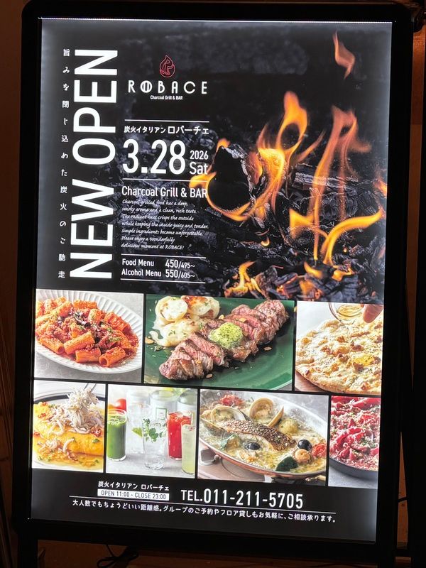 和とイタリアンを融合させた「炭火イタリアン ROBACE(ロバーチェ)札幌駅前店」が2026年3月28日にオープン!お店を手がけるのは、カラオケルーム「ビッグエコー」を展開する株式会社第一興商。「炭火イタリアン ロバーチェ」は新業態として、北海道・札幌で開業を迎えました。