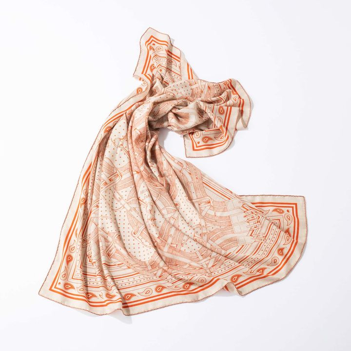 人気のバンダナ柄を取り入れた新作コレクション。鮮やかなオレンジカラーが華やかに肌を彩り、気品ある馬具モチーフとバンダナ柄が日常のコーディネートに洗練された遊び心を添えます。巻き方次第で顔周りに立体感を生み、エレガンスとモード感を絶妙に両立。存在感を放つ逸品です。