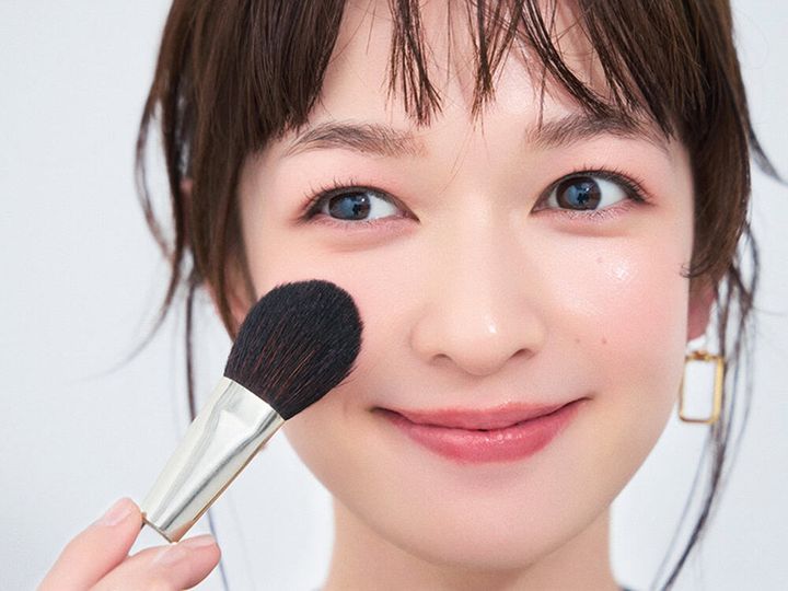 ツヤ感が気になるときは、パウダーをブラシに少量とり、余分な粉を落としてから頰全体にふわっとのせて。