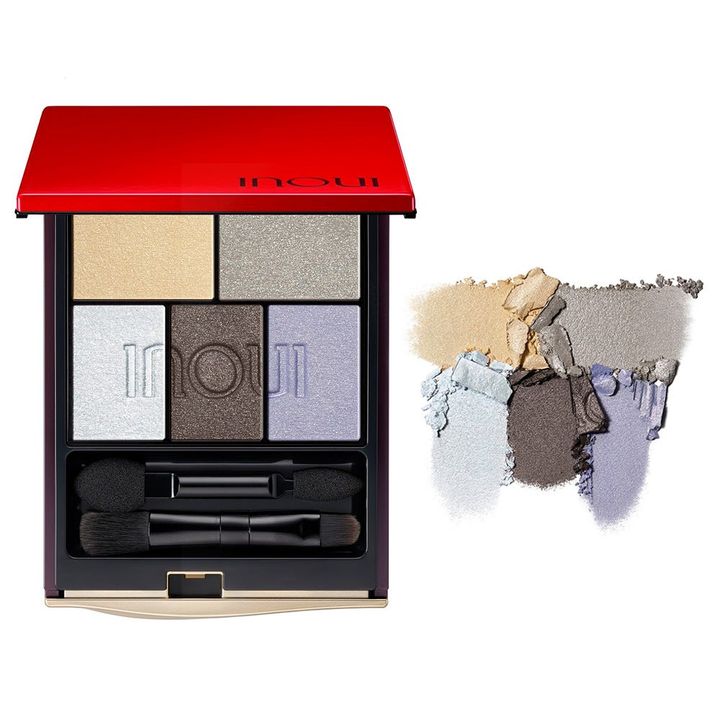 「155 藤二藍 -FUJIFUTAAI」は、コーラル×パープルで夜明け前の空を描いた限定パレット。ブルー〜ピンクに揺らぐ偏光パールがまぶたの上でドラマティックに輝き、神秘的な透明感を生みだす。