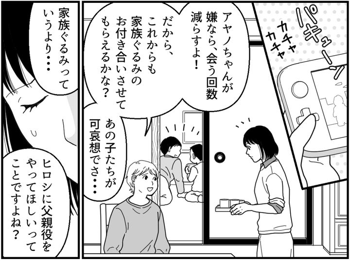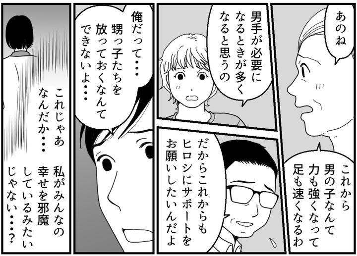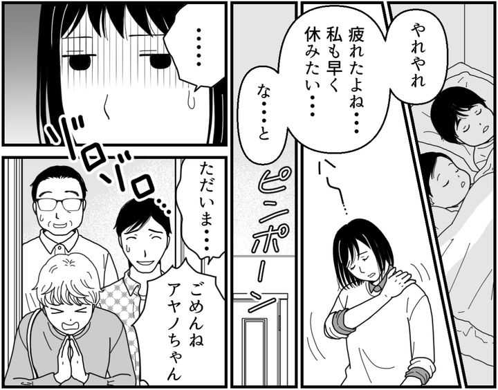 私(アヤノ)は、夫のヒロシと2人の子どもたち(コウ・4才、ミミ・2才)を育てています。義姉のキョウコさんが離婚して以来、義両親とのお出かけは必ず義姉と子どもたち(タロウ・8才、ジロウ・5才)も一緒です。どうやら義両親や義姉は、夫のことを甥っ子たちの「父親」代わりにしたいようです。ハッキリ断らない夫にもイラっとします。私は「帰ったら、今後のことについて話し合いましょう」と夫に告げ、子どもたちを連れて帰宅しました。