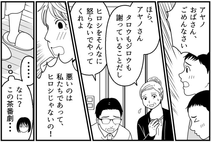 子どもたちを寝かしつけると、夫が帰宅しました。しかも一緒に義両親に義姉、さらには甥っ子たちまでやってきたのです。義姉は甥っ子たちに無理矢理のように頭を下げさせ、お礼や謝罪を言わせてきました。とんだ茶番劇です。