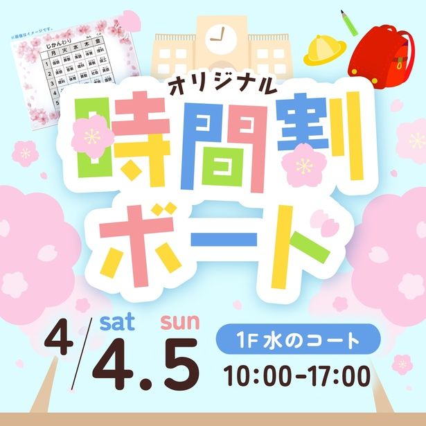 【オリジナル時間割ボードワークショップ】イオンモール四條畷 1F水のコート / 大阪府四條畷市砂4-3-2 / 2026年4月4日(土)・5日(日) / 10:00~17:00 / 参加費400円。イオンモールアプリのキッズクラブクーポン利用で1人100円引き / 予約必須 3月20日(金)10:00よりイオンモールアプリキッズクラブにて予約受付。先着100人 / 小学生以下限定