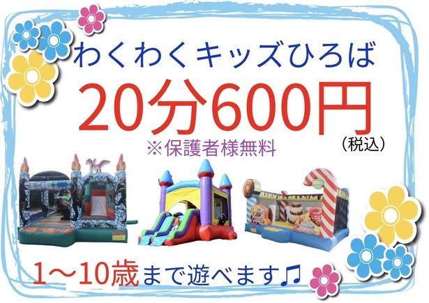 高さ3メートルを超える大型ふわふわ遊具が登場。恐竜や菓子をモチーフにした3種類のエアー遊具で滑り台を滑ったりトランポリンのようにジャンプして遊ぶことができる。20分間遊び放題で、好きな遊具で思いっきり体を動かして楽しめる。