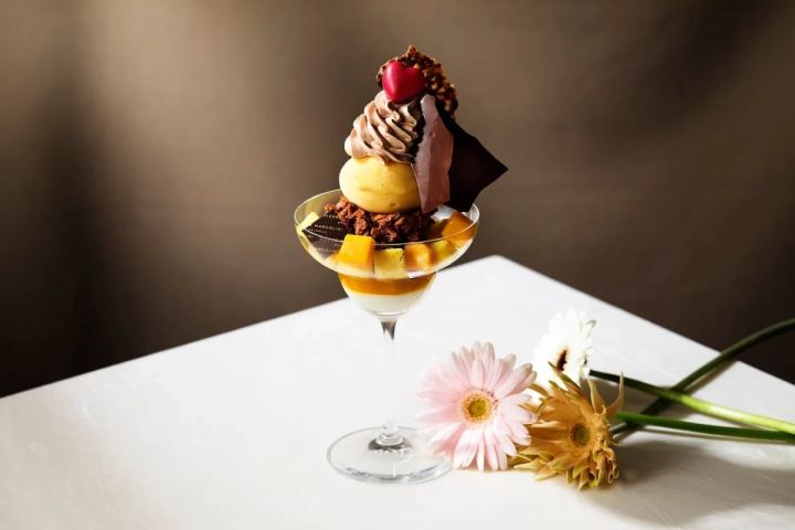 このパフェの魅力は、シャングリ・ラ 東京ならではのオリエンタルなエッセンスが取り入れられている点にもあります。グラスの底には、やさしい口当たりの杏仁豆腐が敷かれ、その上にマンゴーやパッションフルーツのクーリ、しっとりとしたブラウニー、さらにホテルオリジナルの「ヒマラヤンブレンドティーガナッシュ」が重ねられています。