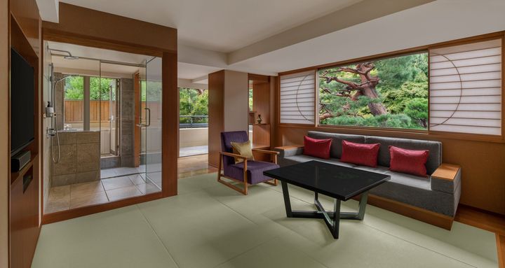 温泉露天風呂付きの客室「暁露(あかつきとつゆ)エグゼクティブスイート」。くつろげる畳の空間が障子窓からの優しい光に包まれます。 Hearst Owned