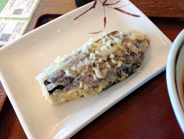 今回は、なすの天ぷら(130円)をチョイス。ほかにもかき揚げやうずらの卵フライ、唐揚げなど、100円台中心の良心的な価格帯がうれしいポイント。