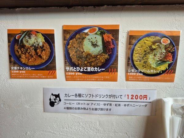カレー各種にソフトドリンク(コーヒー・ゆず茶・紅茶・ゆずハニーソーダ)が付いて「1,200円」です。