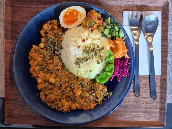 カラフルな副菜は、インドの漬物「紫キャベツのアチャール」や「にんじんのラペ」、「小松菜のスパイス炒め」、「季節野菜のスパイスラタトゥイユ」、インド版の煮卵「半熟卵のアチャール」の5種類。
