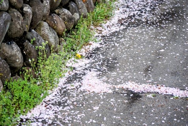 写真は、2025年4月14日に撮影しました。満開を迎えた桜が風で舞い、足下がピンクの絨毯に。