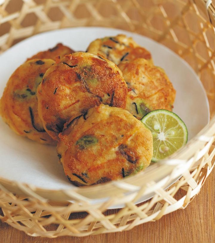 ❸ポリ袋に①を入れ、なめらかになるまで つぶす。【A】を加え、②、枝豆を加えてよくまぜる。手に油(分量外)をつけて円盤状に成形する。