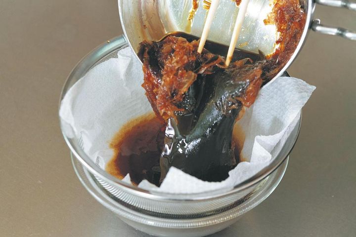 ❹あら熱がとれたらキッチンペーパーとざるでこし、しぼる。