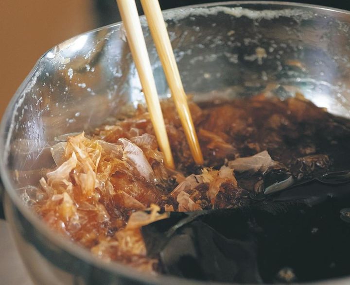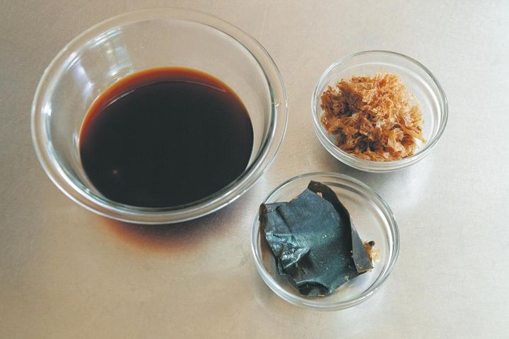 ❺無限つゆは清潔なびんや保存容器に移し、 冷蔵室で保存する。保存期間は1カ月ほど。 かつお節はおかかあえに、こんぶは刻んで煮物に使える。どちらも保存袋に入れて冷凍保存。