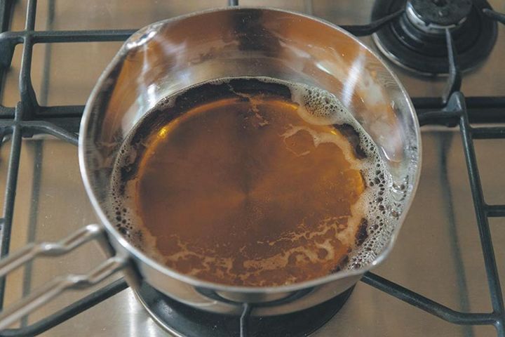 ❷鍋にみりんと酒を入れて火にかけ、沸騰したら弱火にし、3~4分煮立たせる。