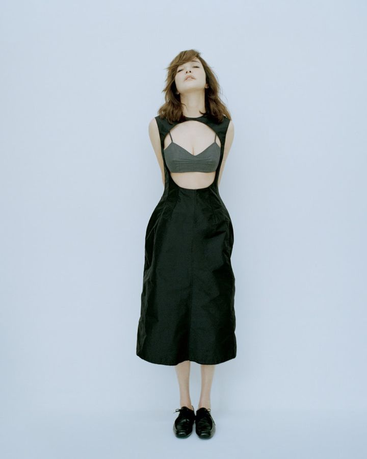 胸元の大胆なカットアウトで「見せ」、ブラトップで「隠す」。アンビバレントなバランスの妙で知的でフレッシュな女性らしさを表現。