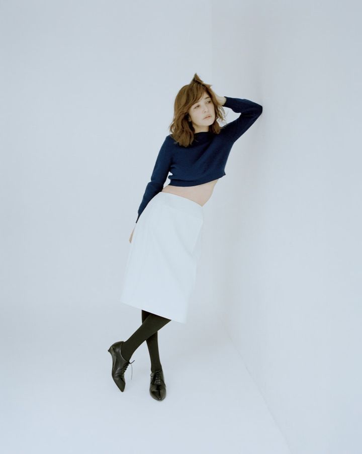 ニット¥162,800、スカート¥231,000、シューズ¥214,500(全てジル サンダー/ジルサンダージャパン)