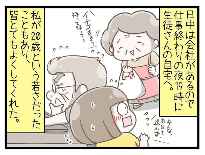 職場の上司からシニア向けの家庭教師のバイトを紹介され、会社帰りに引き受けることになった作者。高齢の女性に教えることになり家を訪れるが、そこで恐ろしい目に遭う。荒れ果てた室内に漂う異臭――それだけでも異様だったが、作者を震撼させたのは、「生徒」がその女性ではなかったこと。不気味な笑みを浮かべる女性の真意とは――。