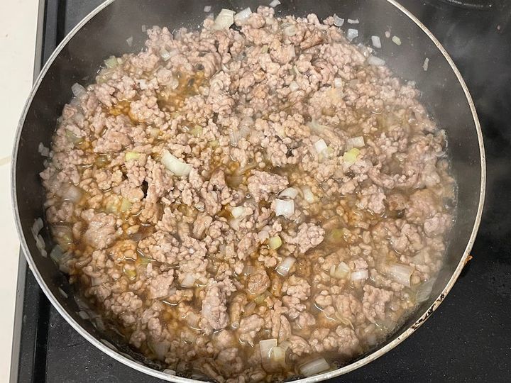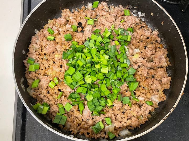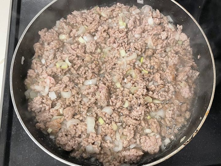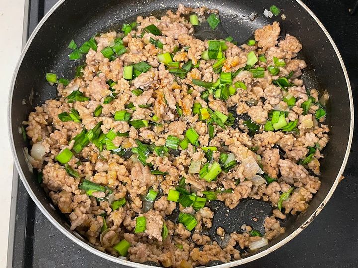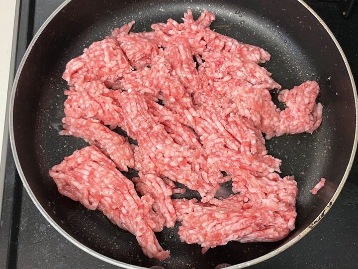 1. 熱したフライパンにゴマ油を引き、豚ひき肉を中火で4~5分炒める。