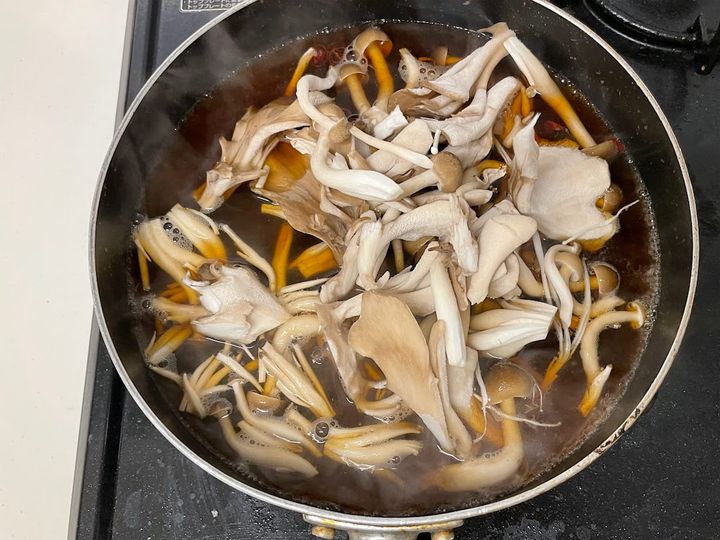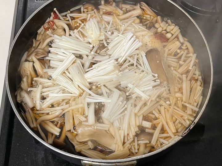 2. 3~4分ほどで沸騰してきたら、しめじとまいたけを加える。