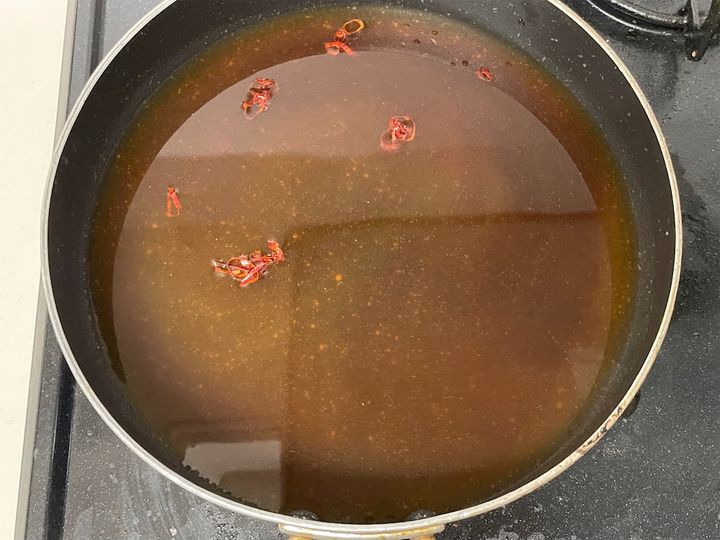 1. 鍋にだし、しょうゆ、みりん、料理酒、鷹の爪を入れて中火で沸騰させる。