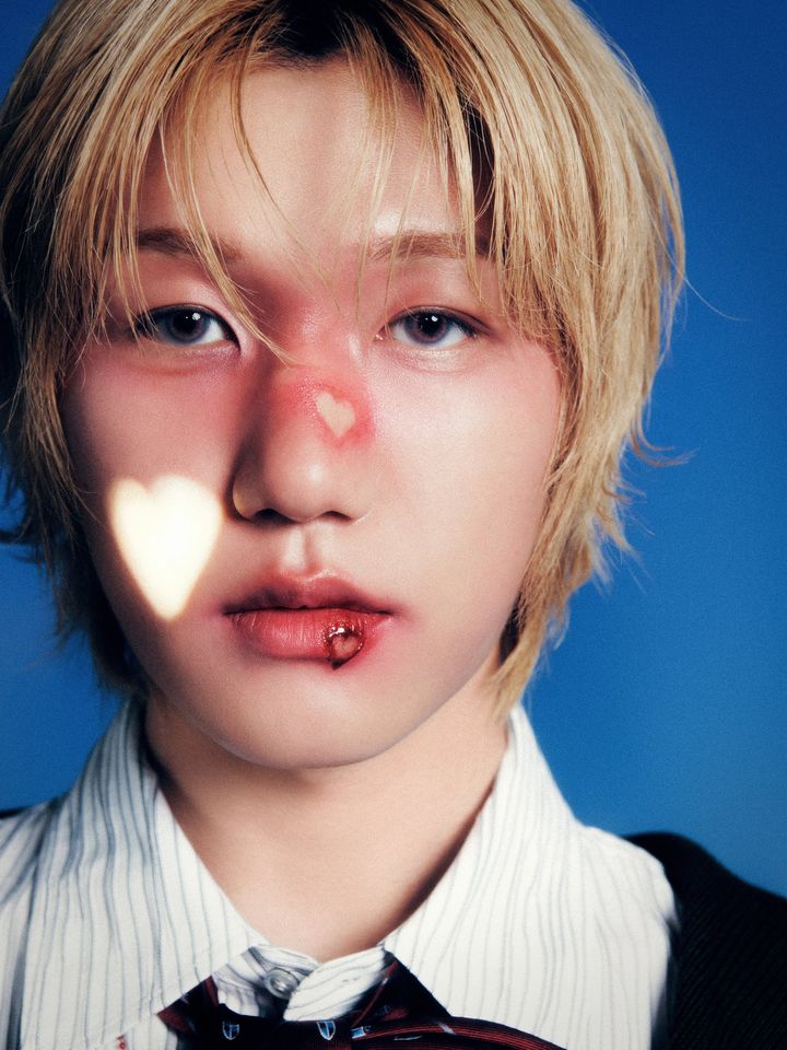 ハート型にくり抜いた赤チークと、血で描いたようなハートを口元に施し、毒っ気とラブリーさが交差するメイクを完成。ぽわっと火照ったような表情が、おしゃれな顔立ちのジョンソプによく映えて。