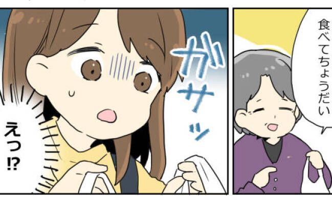 その日以降、会うたびにお菓子や食べ物をくれるようになった女性。なかなか断りきれず、女性は食べる様子を見届けるまで帰ってくれないので、私がその場で一口だけ食べるようになりました。