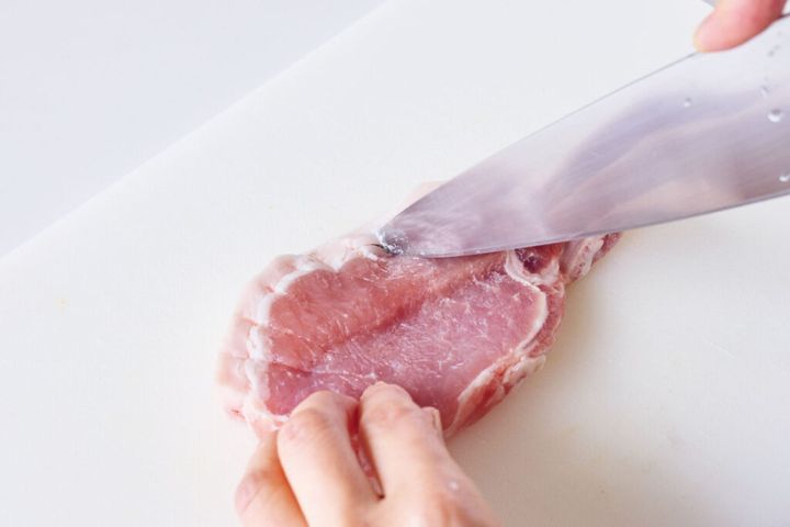 厚みのあるとんカツ用の豚肉は、筋切りをしておくと、焼いたときに丸まったりすることがなく、むらなく火が通ります。包丁の刃先がまな板に届くくらいまで刺してOKです。