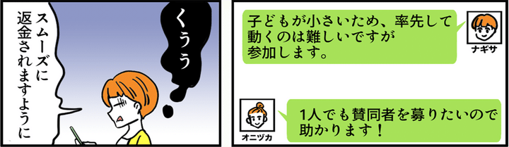 私はナギサ。現在は育休中で0歳の娘を育てています。私は育休を利用してスキルを身につけたいと思い、数十万円を払ってホウジョウさんという女性が主催しているオンラインサロンに入会しました。しかし主催者が出てこないうえ講義内容や指導があまりに薄っぺらくて、私の違和感は大きくなるばかり。そんなある日、同じ受講生として参加していたオニヅカさんから「返金請求に参加しませんか?」というメッセージが届いたのでした。