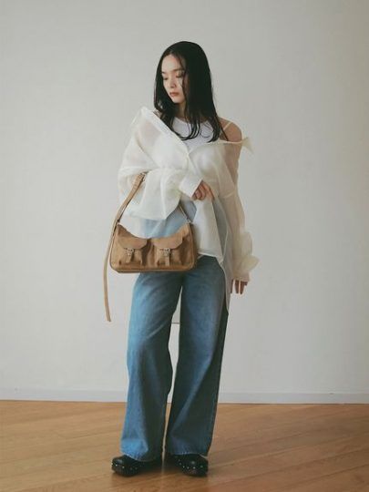 前ボタンは2つほど開けて、肩落ちしたスタイリングにしてみましょう。デニムはワイドデニムやカーブジーンズで、今っぽいシルエットを狙って。