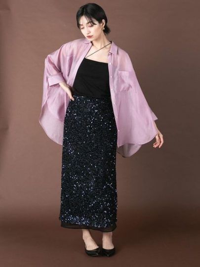 やわらかなピンクのシアーシャツを主役にした、春らしい華やぎスタイル。ゆったりとしたオーバーサイズシルエットが、ブラックのインナーとスパンコールスカートの存在感をほどよく和らげ、抜け感のあるバランスに整えています。