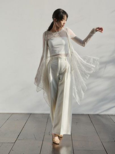 やわらかな光をまとったようなオールホワイトのシアーコーデは、春先にぴったりの装い。透け感のあるロングカーディガン風のシアートップスを羽織ることで、シンプルなインナー×ワイドパンツのスタイルに奥行きが生まれます。