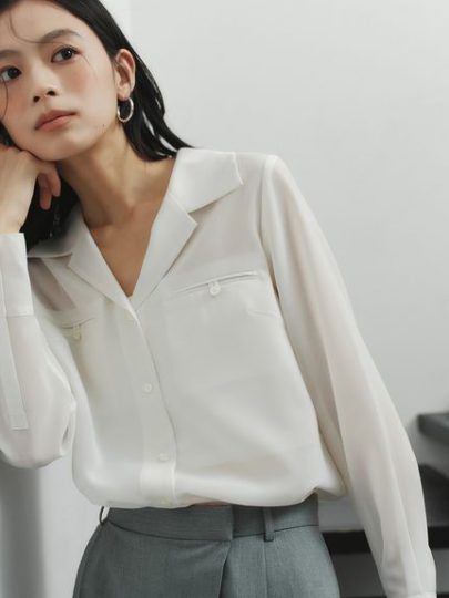 オフィスコーデには向かないと思われがちなシアーシャツですが、それも着こなし次第!透け感の強くない開衿タイプのシアーシャツできちんと感を出しましょう。