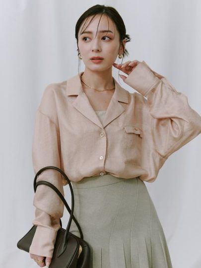 シアーシャツの襟元や、袖、裾をチラ見せさせるとコーデの華やかさも出てきますね。通常のシャツよりも、優しい印象を与えられるので、おすすめです。