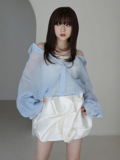 淡いアイスブルーのシアーシャツが目を引く、爽やかなスタイル。ふんわりとしたボリュームスリーブと透け感のある素材が、軽やかで女性らしい印象を演出します。肩をほんのり落として着こなすことで、抜け感のあるシルエットに。