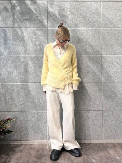 ふわふわ素材のニットカーデを羽織って異素材MIXのコージースタイル