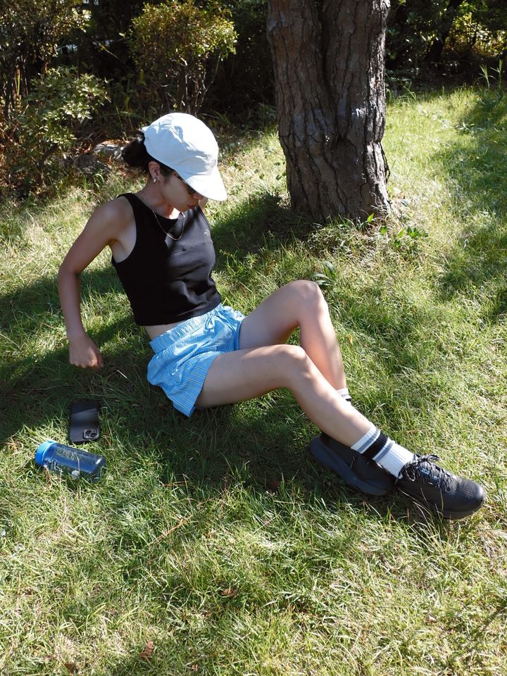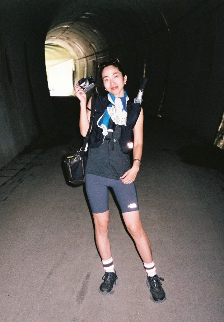 AYAさんは、「寄り道することも多いので、荷物が入る少し大きめのトレランパックを愛用中。ドリンクはもちろん傘なども入ります。ショートタイツとあわせるのが定番スタイルです」と教えてくれた。