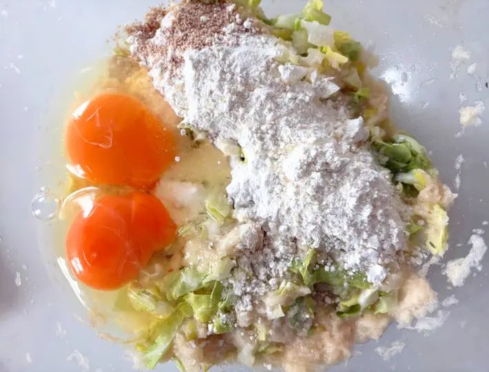 さらに薄力粉、卵、和風だしの素も加えてください。