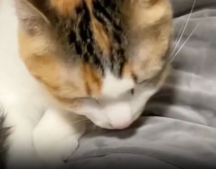 毛布の上で毛づくろいに夢中な猫 まさかの勘違いに「ずっと見ておられる」「たまらない」の声