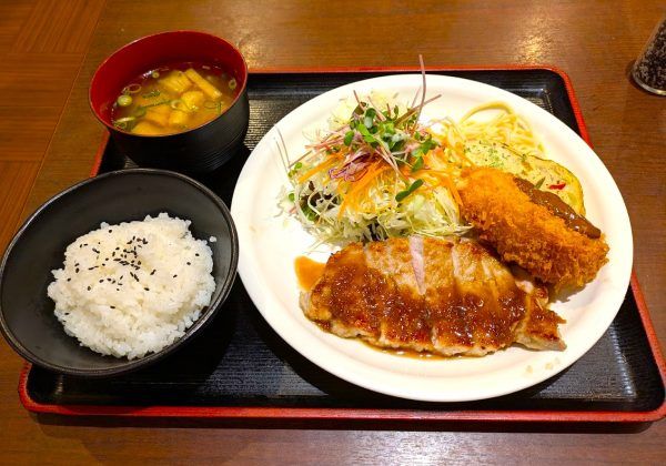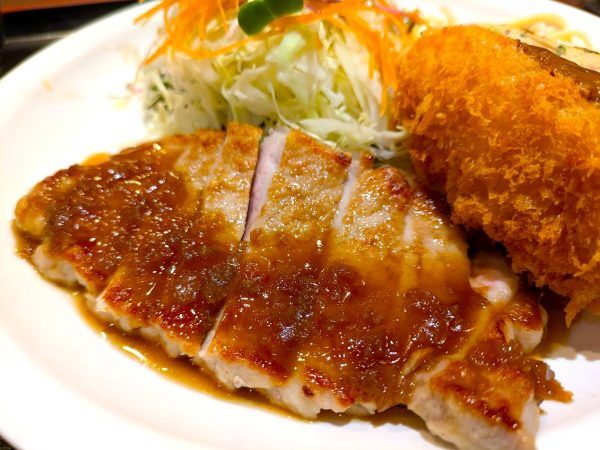 豚テキ&グラタンコロッケ&スパニッシュオムレツの豪華定食、900円!