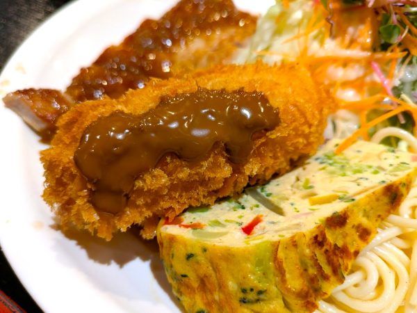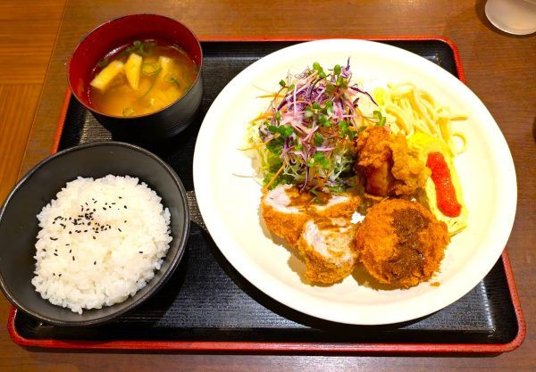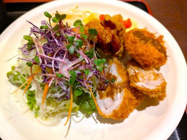 山盛りサラダです。高さがあります。ミルフィーユカツは年輪のようにキレイに巻かれてギュッと詰まった食感がいいですね~。濃厚なクリームコロッケとカラッと揚がった鶏の唐揚げ。キレイに巻かれただし巻き玉子から出汁がジュワっとお口の中が瑞々しく、明太子とも相性が良いです。