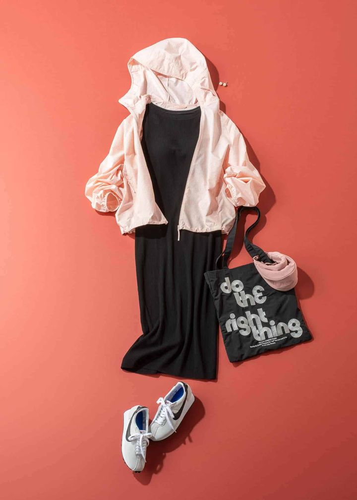 アクティブな予定の日にパッと羽織りたいシャカシャカアウターこそ、ときめく色が正解!らくちん黒ワンピとのカジュアルコーデも、手抜き感ゼロで華やぎます。